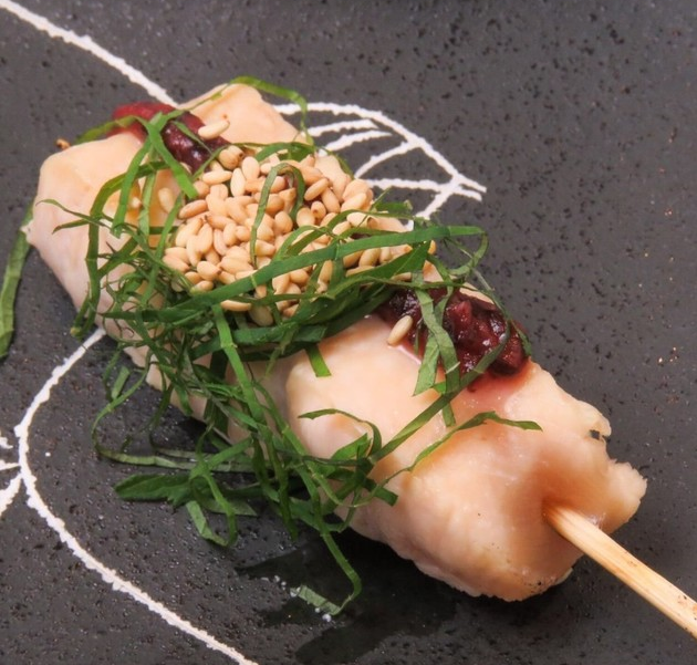 꼬치에 끼워 직화구이 한 연한 닭가슴살에 고추냉이를 얹은 요리.