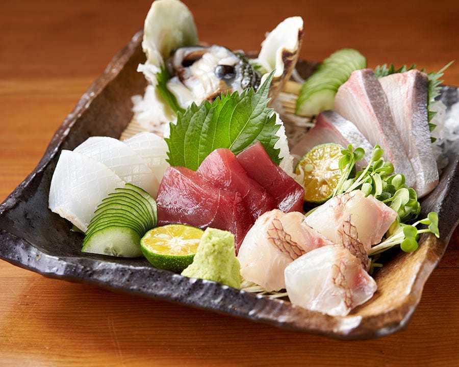 작게 자른 생참치 위에 갈은 참마즙을 뿌린 요리.