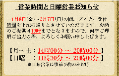 월~토/국경일 전날 디너:17:00~23:00(L.O.22:00, 드링크 L.O.22:00)