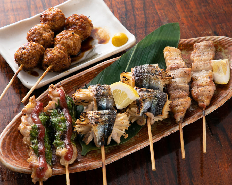 한입 크기의 카시라라고 불리는 돼지 볼살 부분을 꼬치에 끼워 직화구이 한 요리.