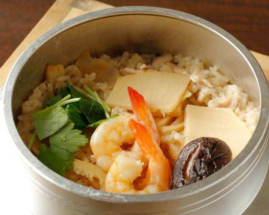 시기에 따라 바뀌는 쌀과 표고버섯과 닭고기 등의 재료를 일인용 솥으로 지은 요리.