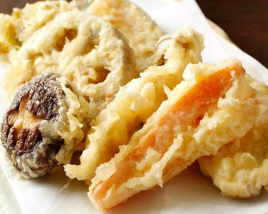 시기에 따라 바뀌는 채소에 밀가루의 튀김옷을 입혀서 기름으로 튀긴 요리.