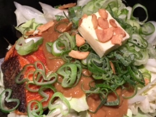 연어와 채소 등 각종 재료에 된장 맛 양념장을 얹고 찜구이한 요리.