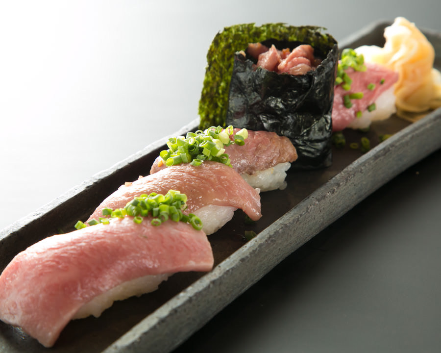 초밥 위에 얇게 자른 소고기를 얹고 빚은 요리.