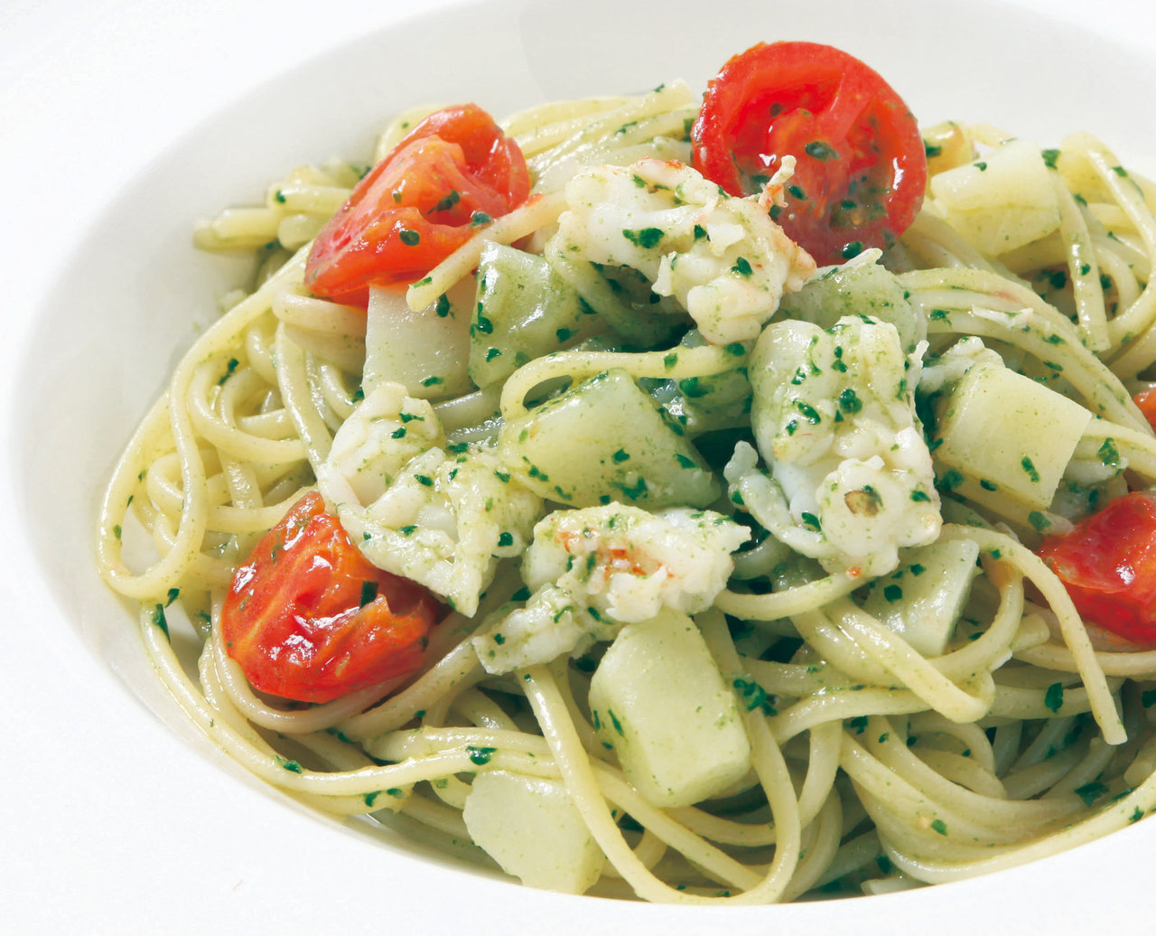 링귀네, 새우, 마늘, 감자, 토마토, 치즈