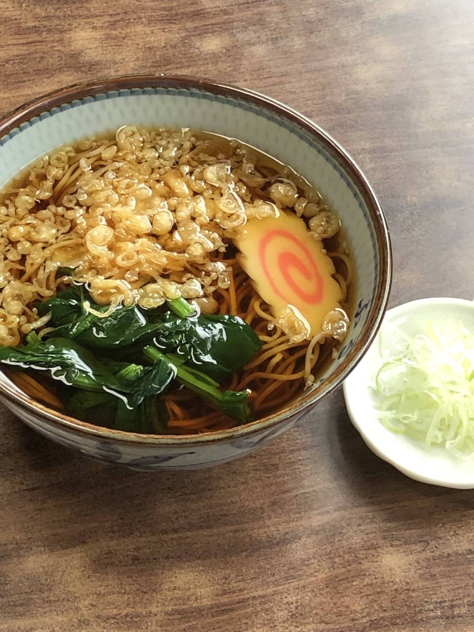 따뜻한 메밀국수에 오리고기와 파가 들어간, 따뜻한 국물을 끼얹은 요리.