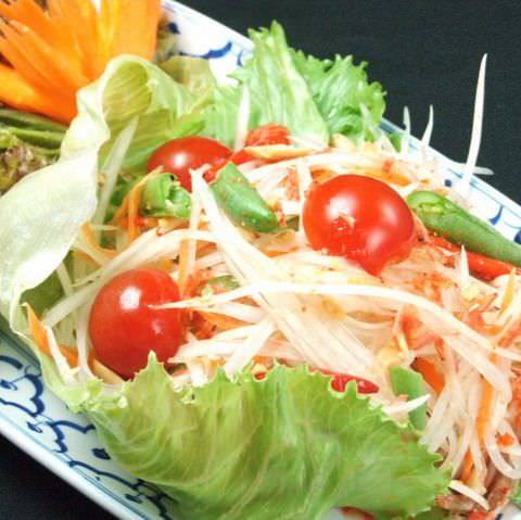 파파야와 고추, 태국 특유의 허브 등과 섞은 샐러드 요리.