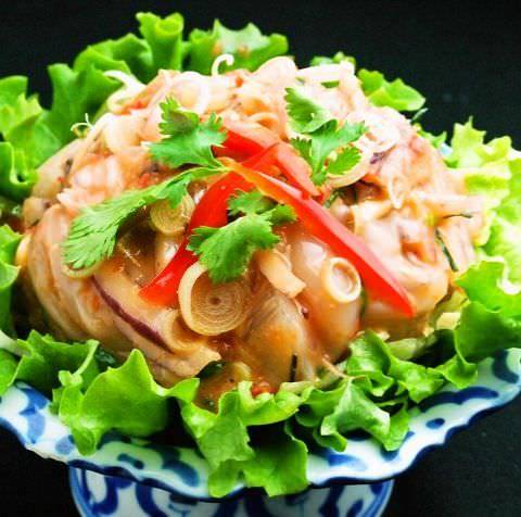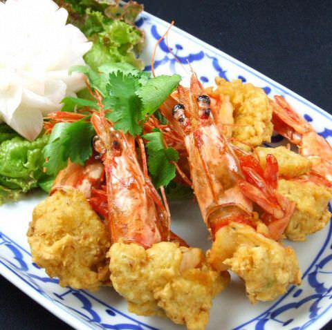 생새우에 태국 특유의 허브와 향신료를 얹고 남플라 등이 들어간 소스로 맛을 낸 요리.