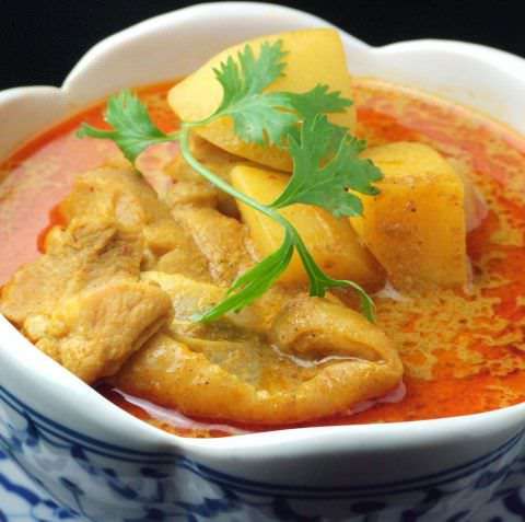 고기와 해물, 채소 등에 프릭퀴느(고추의 일종) 등 태국 특유의 향신료와 허브를 넣고 끓인 레드 카레 덮밥.
