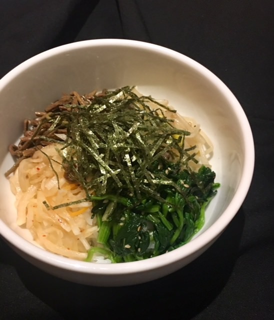 콩나물 등 채소를 데치고 참기름과 소금으로 무쳐 담아낸 요리.
