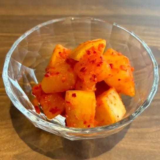 한입 크기의 사각형으로 자른 무를 김치로 담근 요리.