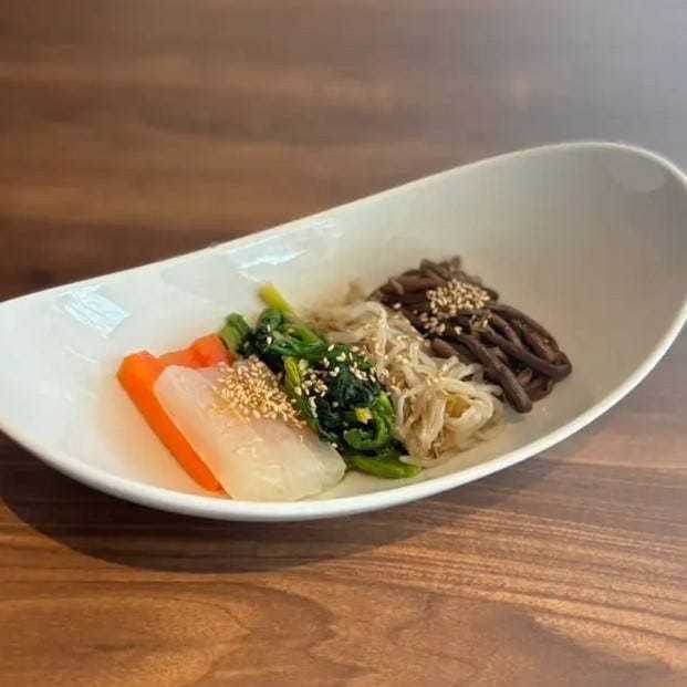 콩나물 등 채소를 데치고 참기름과 소금으로 무쳐 담아낸 요리.
