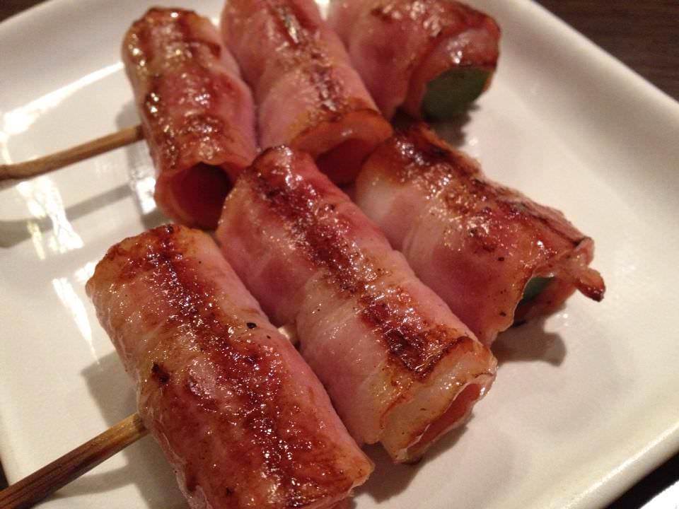 베이컨으로 말은 아스파라거스를 꼬치에 끼워 직화구이 한 요리.