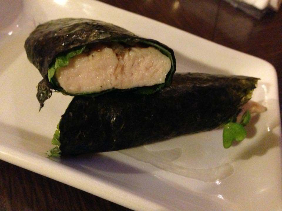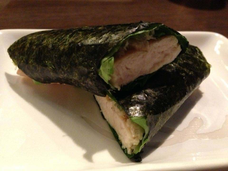 김 위에 닭가슴살과 와사비를 올려 함께 말은 요리.