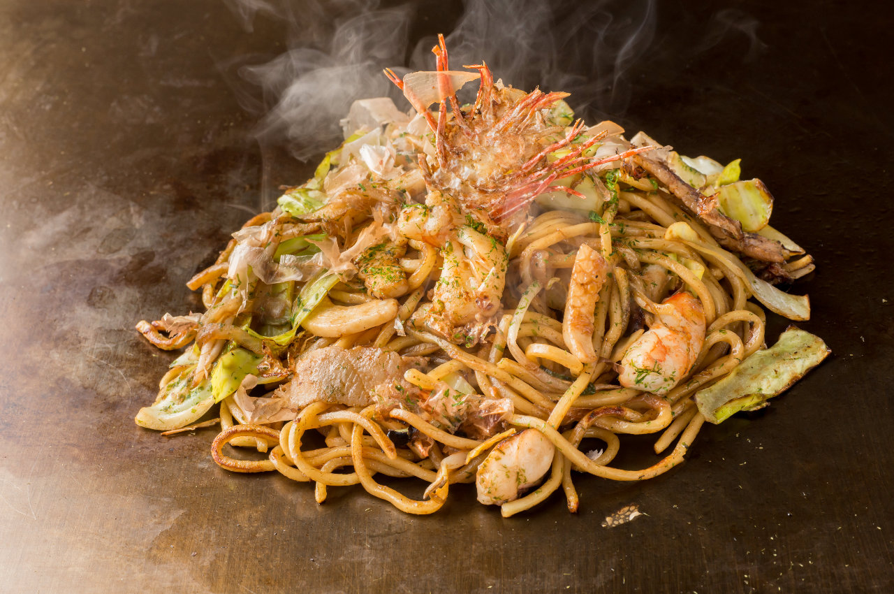 끓인 중화 면를 오코노미야키 위에 겹쳐 구운 요리.