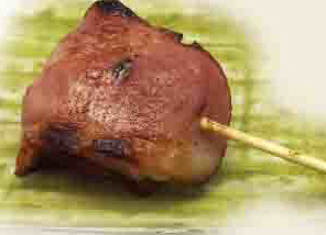 치즈와 베이컨을 꼬치에 꿰어 직화구이한 요리.