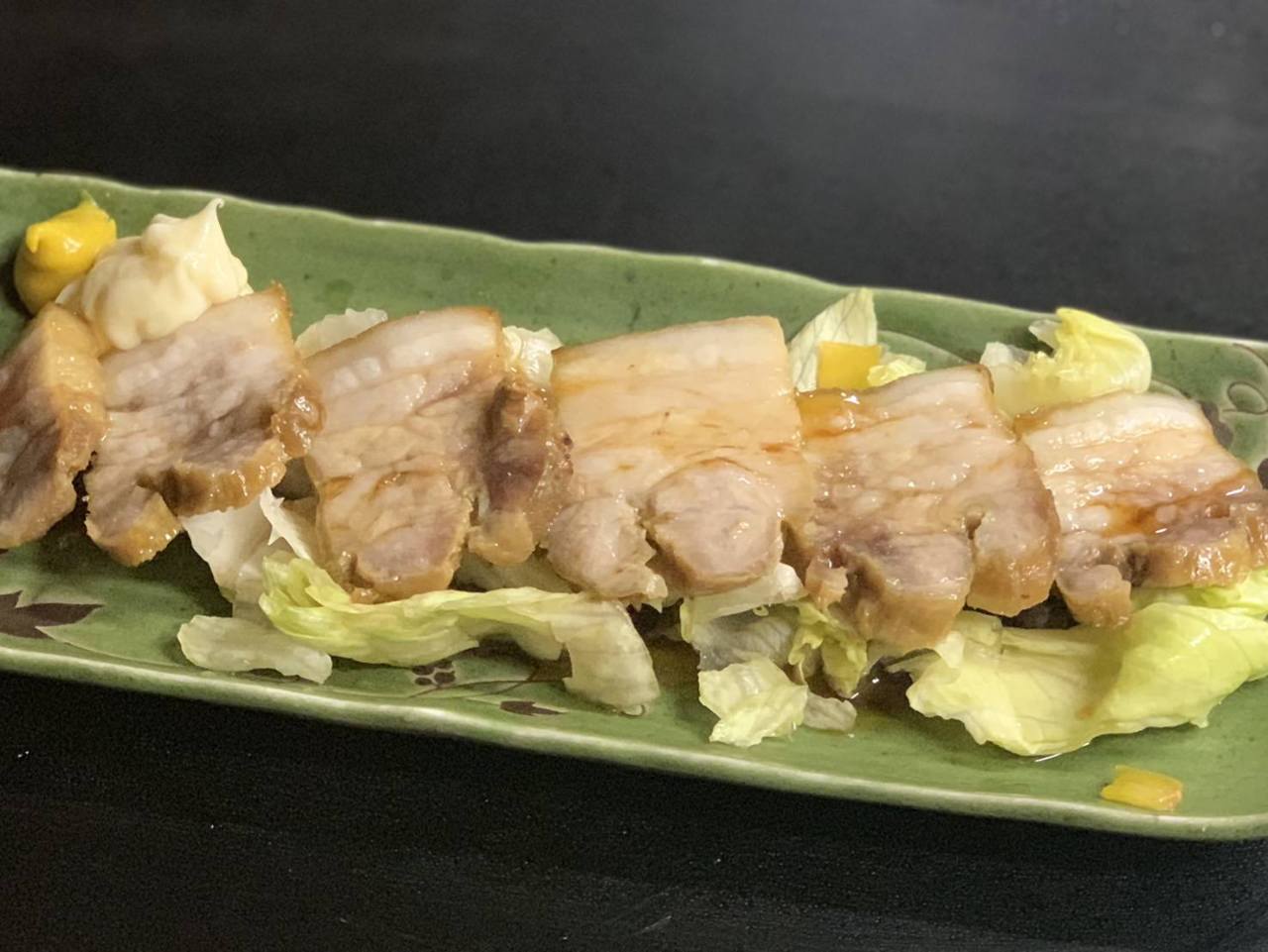 돼지삼겹살과 양배추 등의 재료를 달걀을 푼 반죽에 싸서 구운 요리.