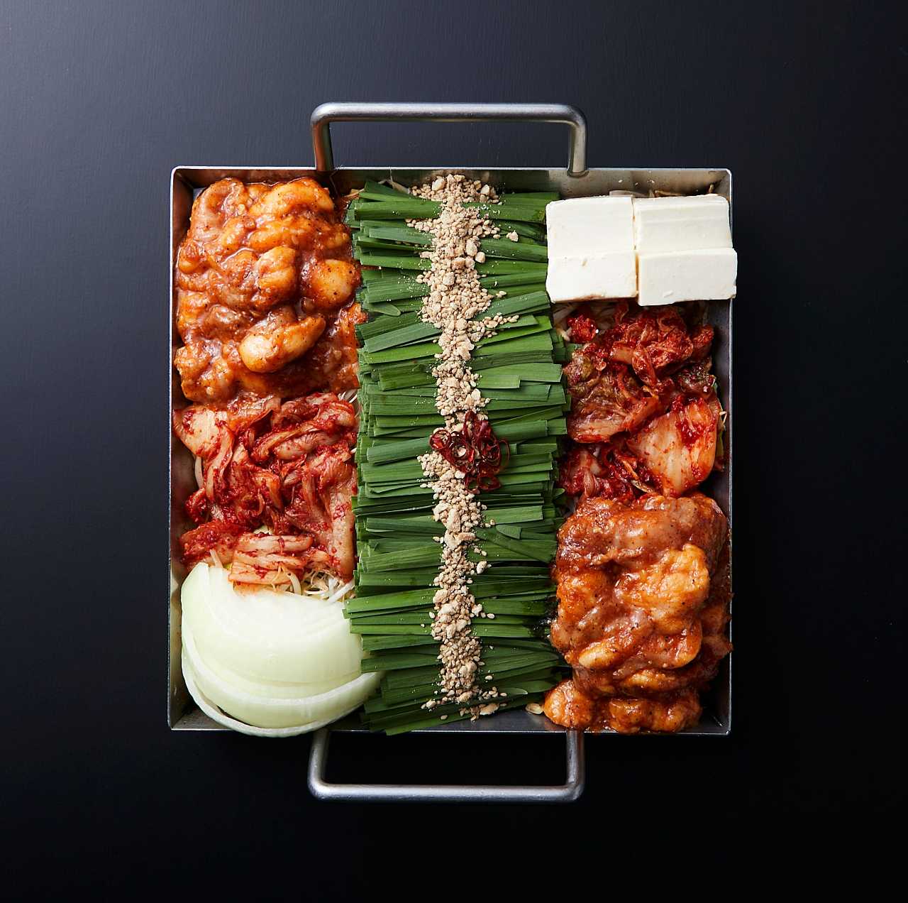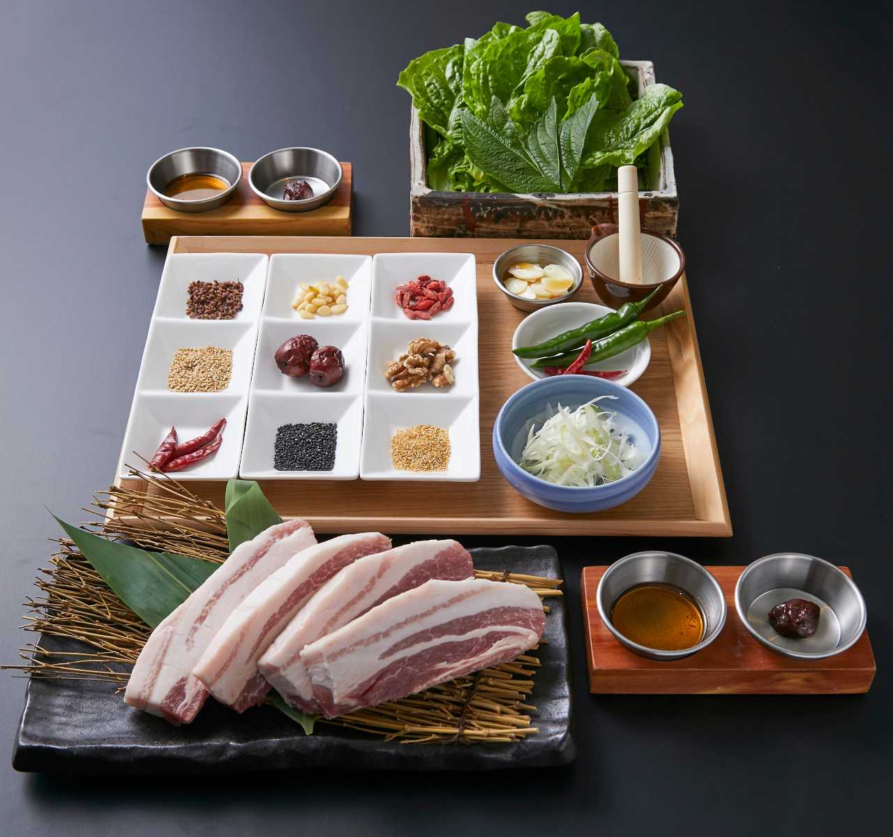두껍게 썬 삼겹살을 철판에 구워 잎채소와 조미료에 찍어 먹는 요리.