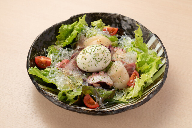생해산물을 잘게 썰고 여러 가지 양념과 조미료를 무쳐서 달걀노른자를 올린 요리.