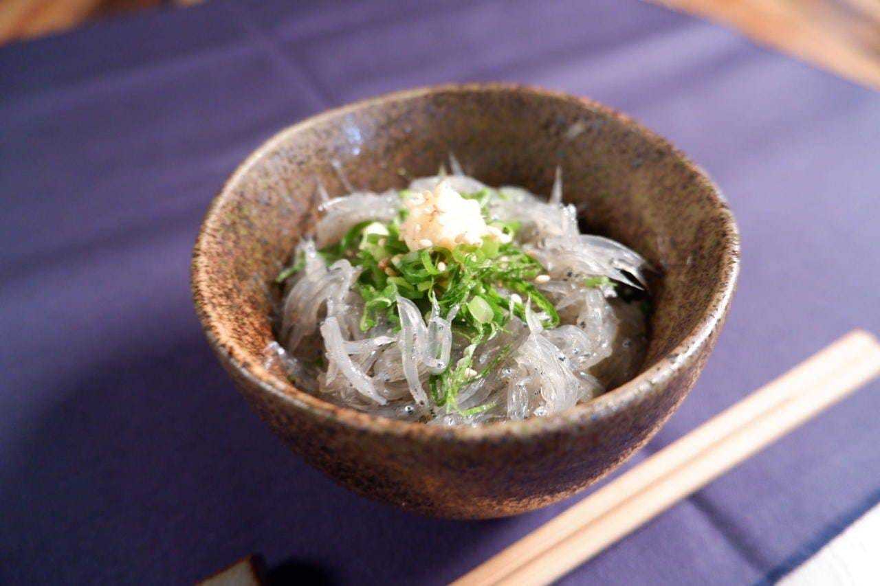 덮밥 그릇에 담은 밥에 생 뱅어를 얹은 요리.