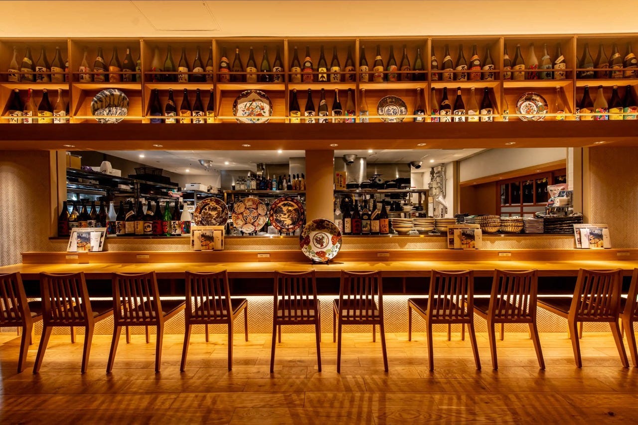 규슈 직송의 식재료를 사용한 요리, 150종류 이상의 술과 오픈 키친의 카운터석, 개인실 완비
