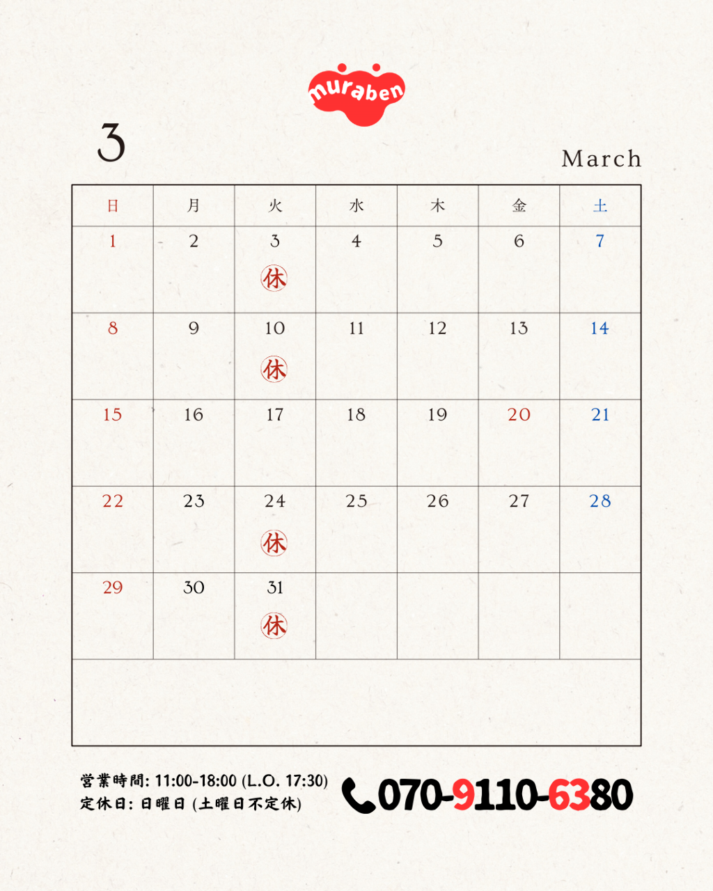 | 정규휴일 | 제1화요일 제2화요일 제4화요일 제5화요일 |