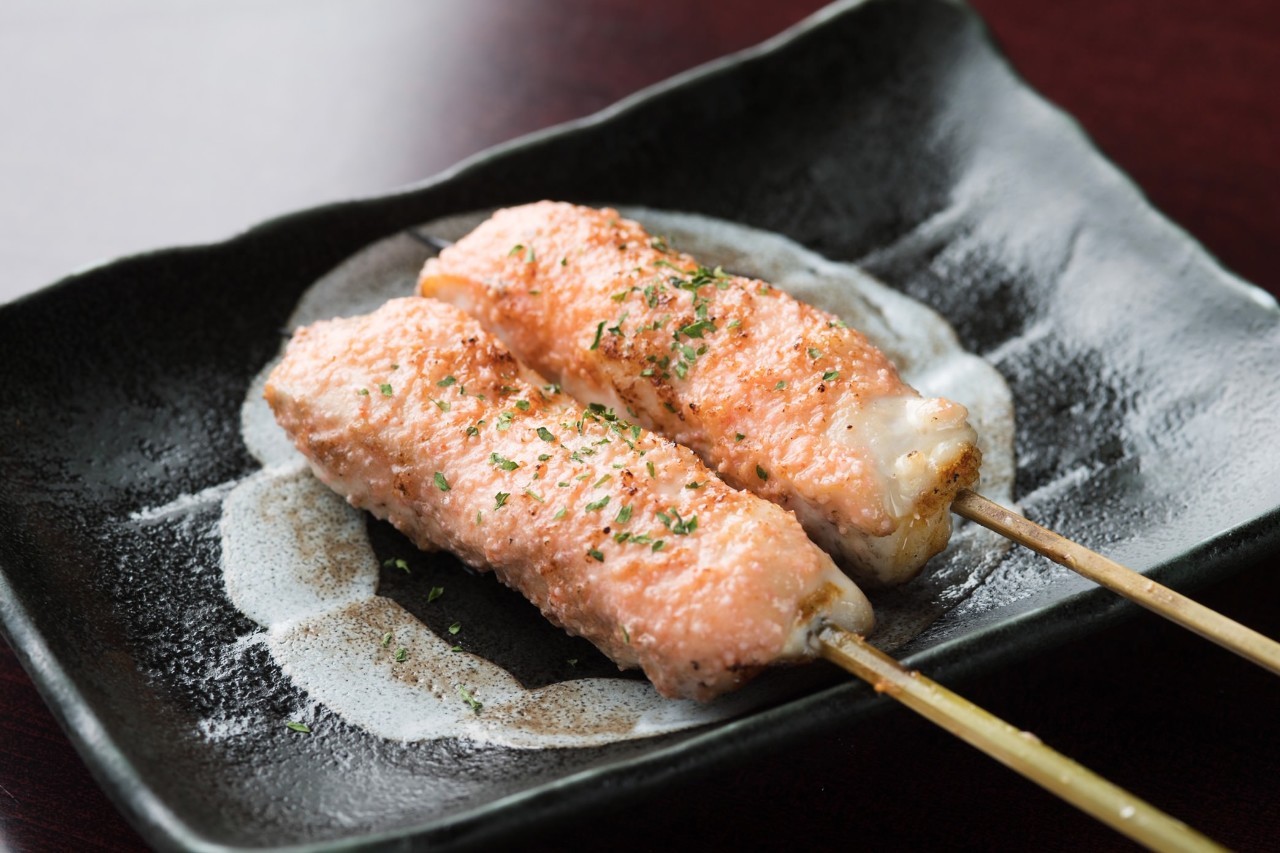 꼬치에 꽂아 직화 구이 한 닭 가슴살에 명란을 얹은 요리.