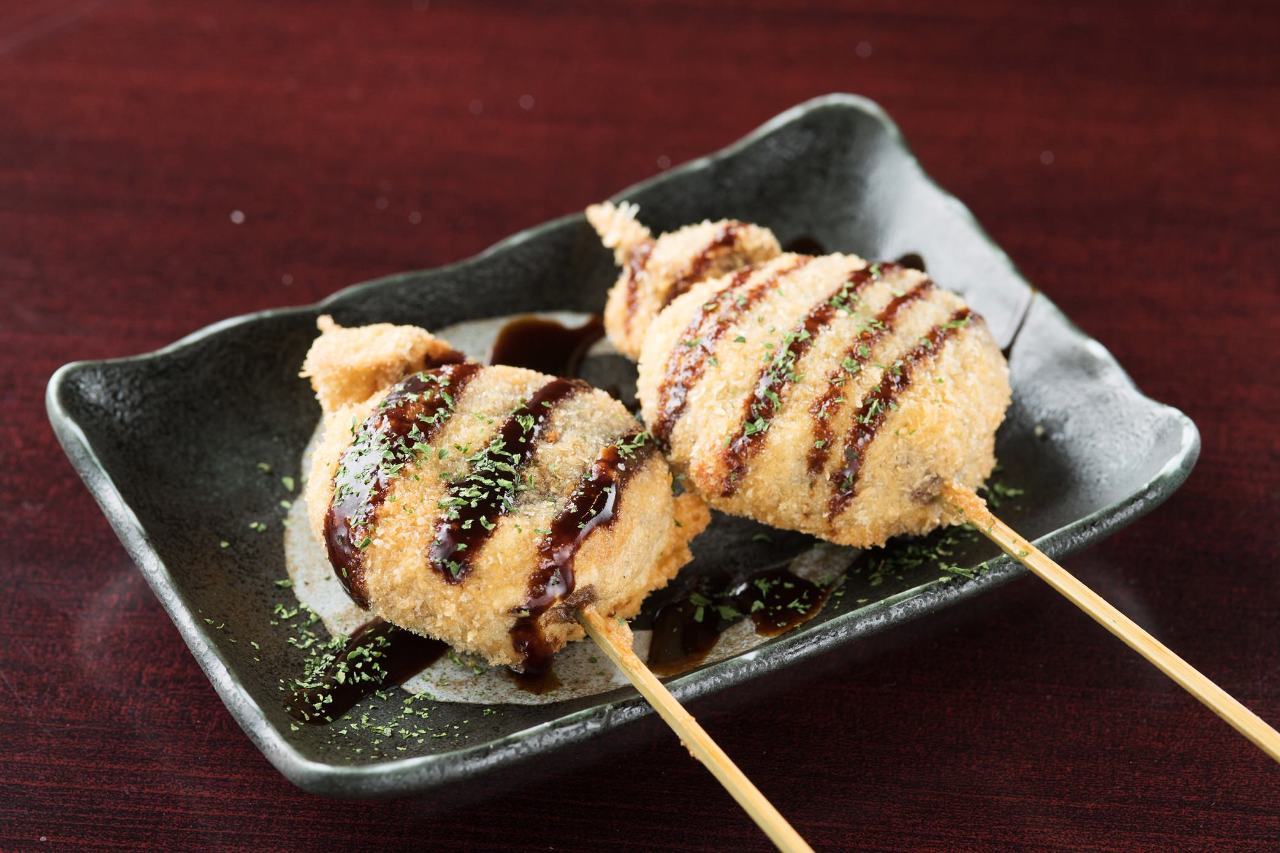 여러가지 재료를 꼬치에 꿰어 튀김옷을 입힌 후 기름에 튀긴 모둠 요리.