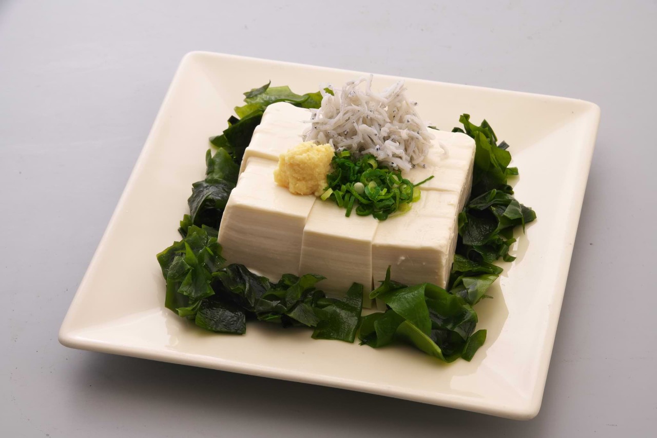 찬 두부에 양념을 올려 간장과 함께 먹는 요리.