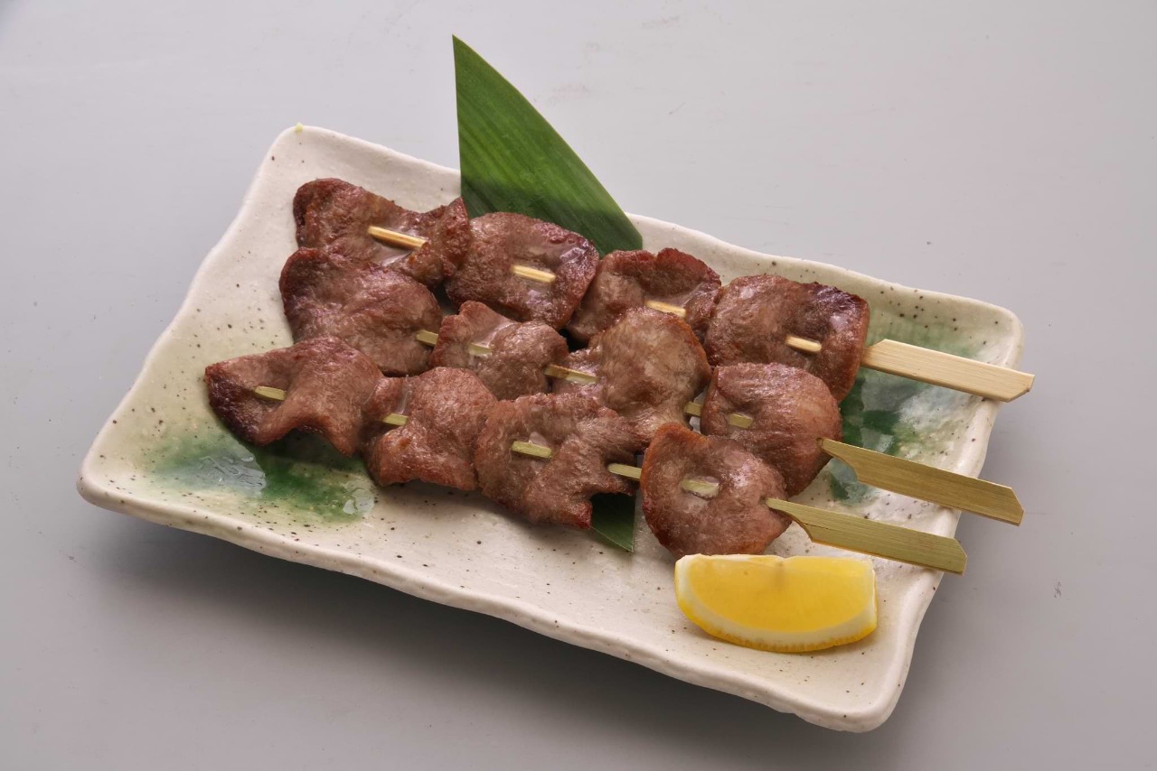 한입 크기의 우설(소혀)을 꼬치에 끼워 직화구이 한 요리.