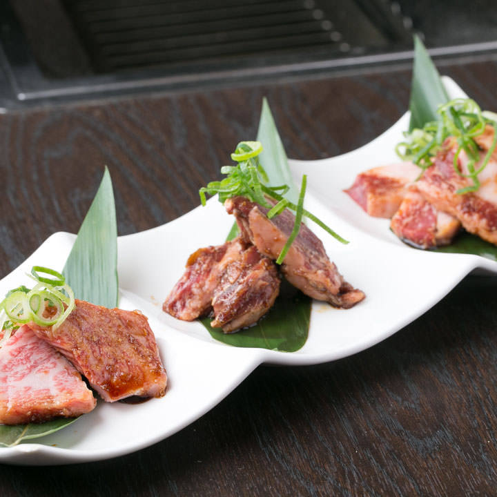 3가지 종류의 곱창이라고 불리는 부분의 모둠 요리.