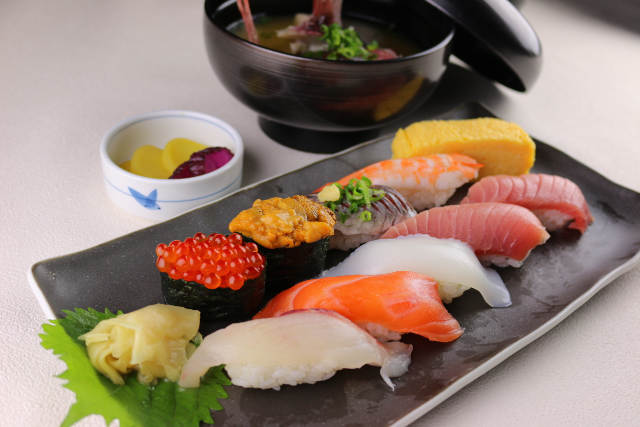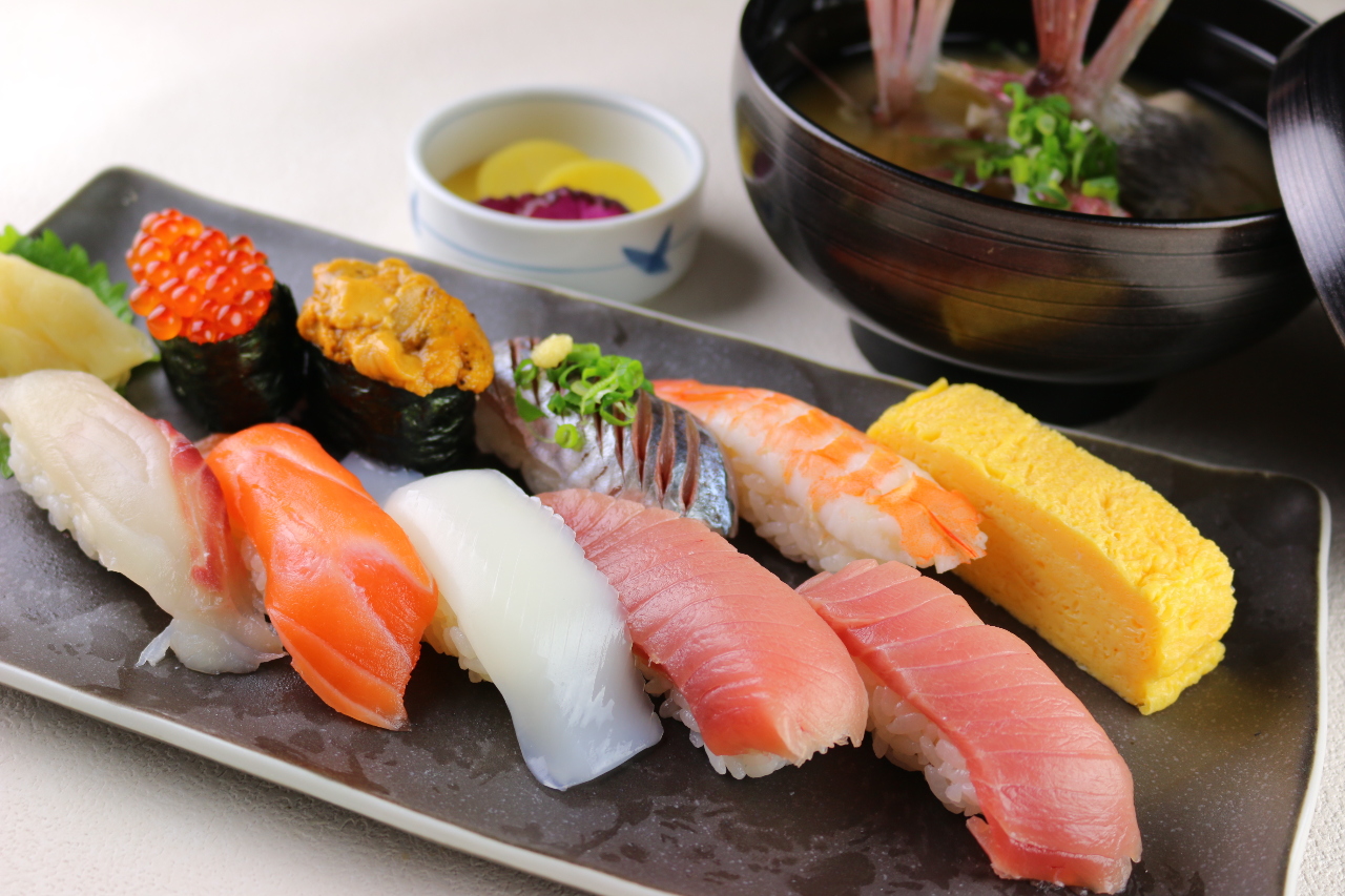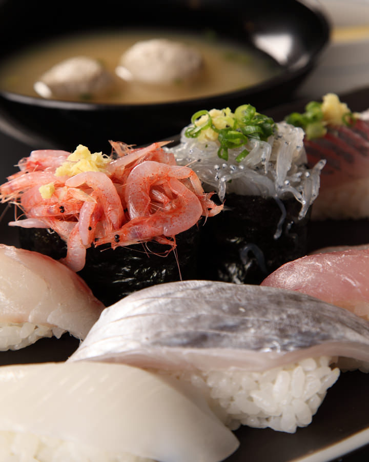 초밥, 젓새우, 뱅어, 도미, 참치, 오징어, 전갱이, 흰살 생선, 푸른 차조기 잎