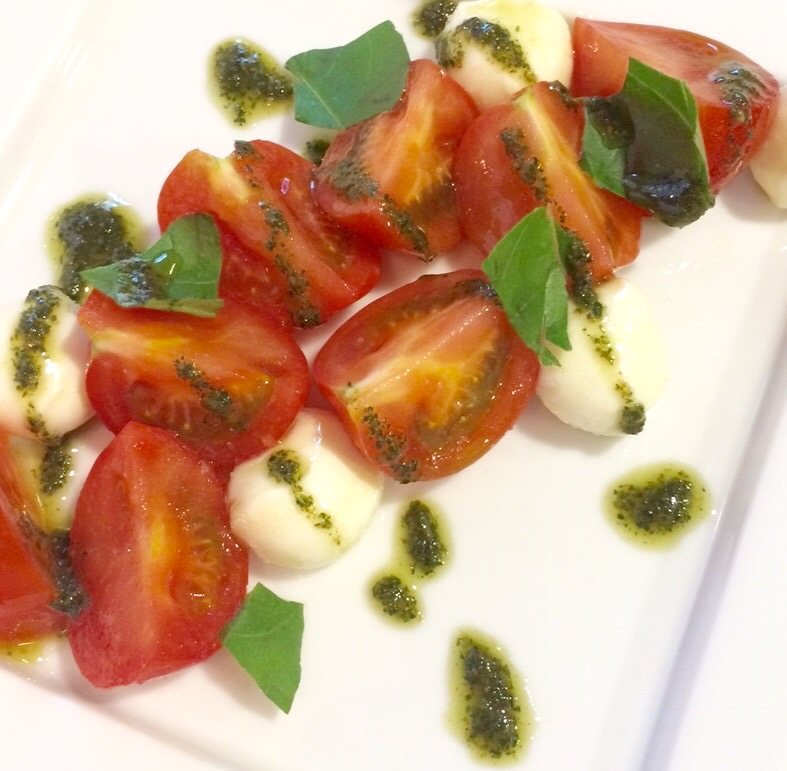 자른 토마토와 모차렐라치즈에 올리브 오일과 소금 후추를 뿌리고 바질을 올린 요리.