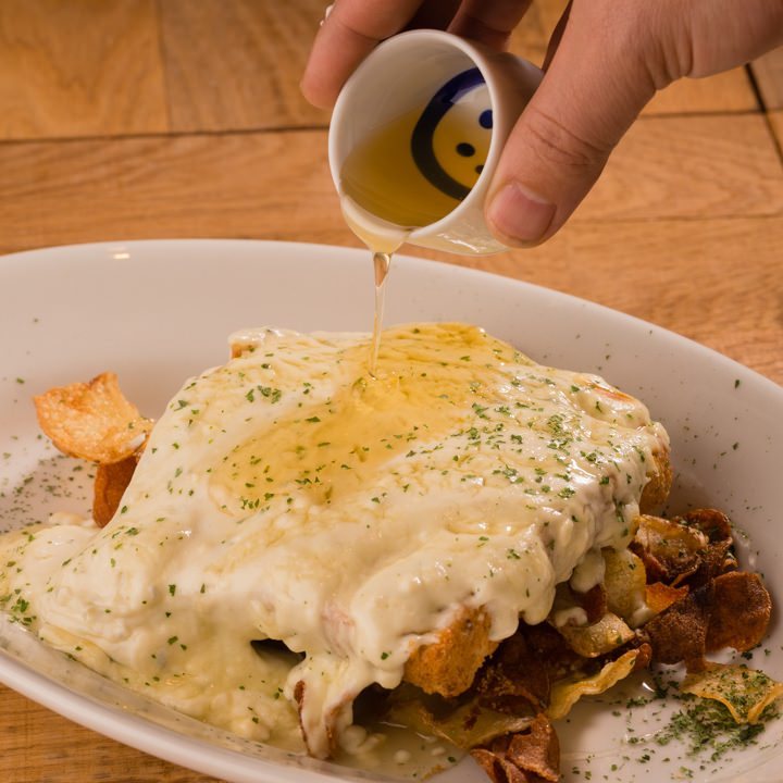 식빵에 치즈를 얹어 굽고 꿀을 뿌린 뒤 프라이드 포테이토를 곁들인 요리.