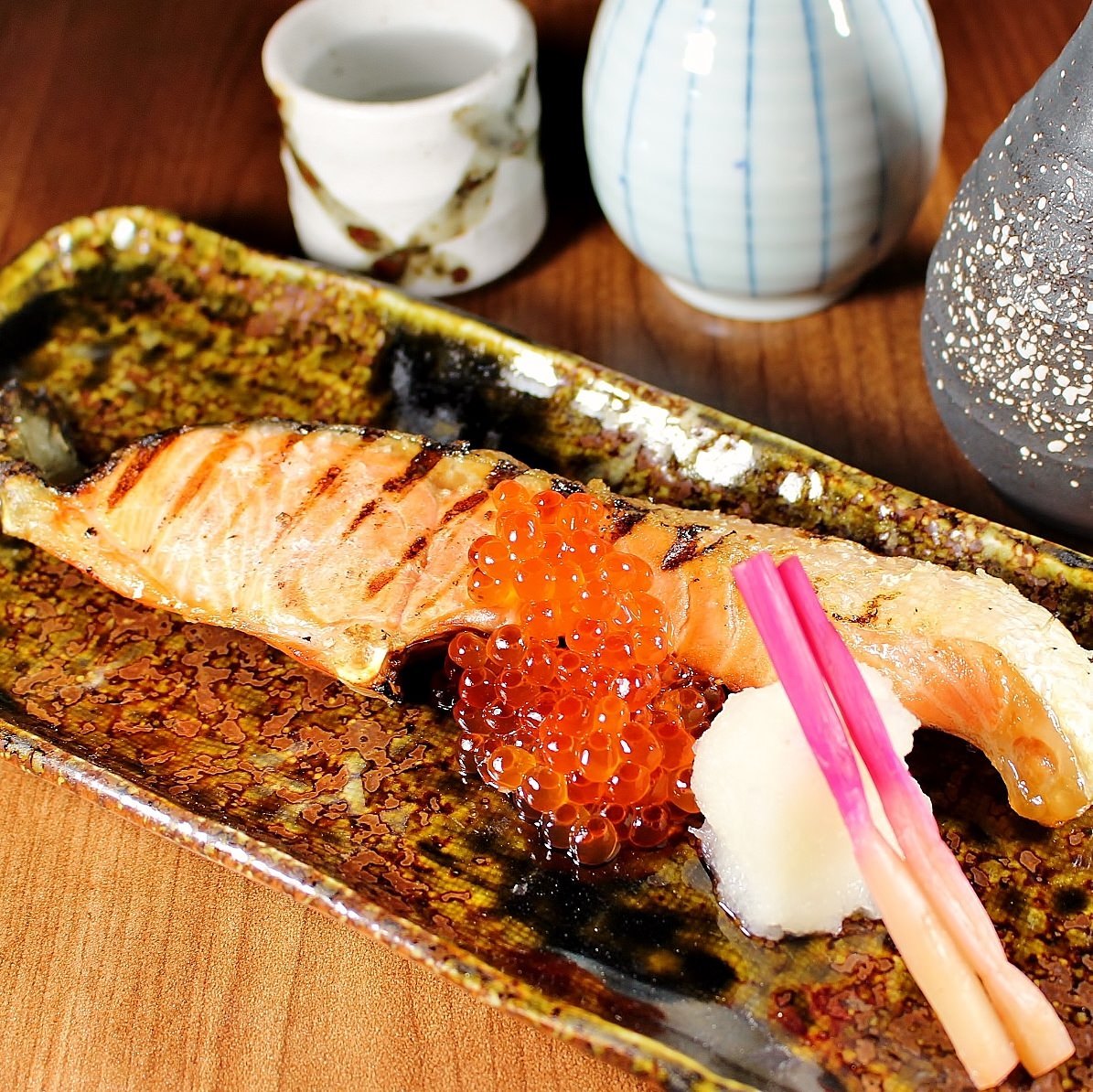 밥 위에 연어와 연어알(하라코)을 얹은 요리.