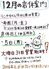 화~토 디너:17:00~24:00(L.O.23:00, 드링크 L.O.23:00) 날 디너:16:00~23:00(L.O.22:00, 드링크 L.O.22:00) 토/날 런치:11:30~14:00