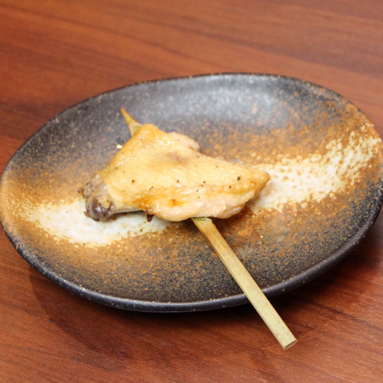 한입 크기의 닭 껍질을 꼬치에 끼워 직화구이 한 요리.