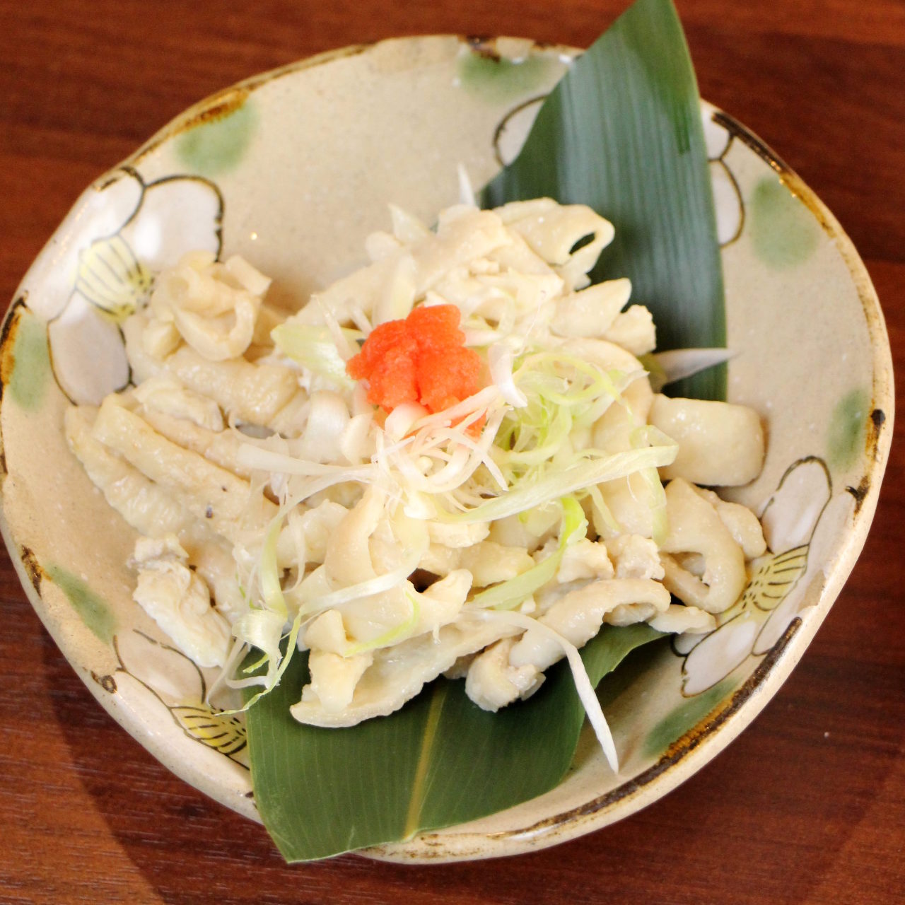 얇게 자른 어묵에다 와사비와 간장을 곁들인 요리.