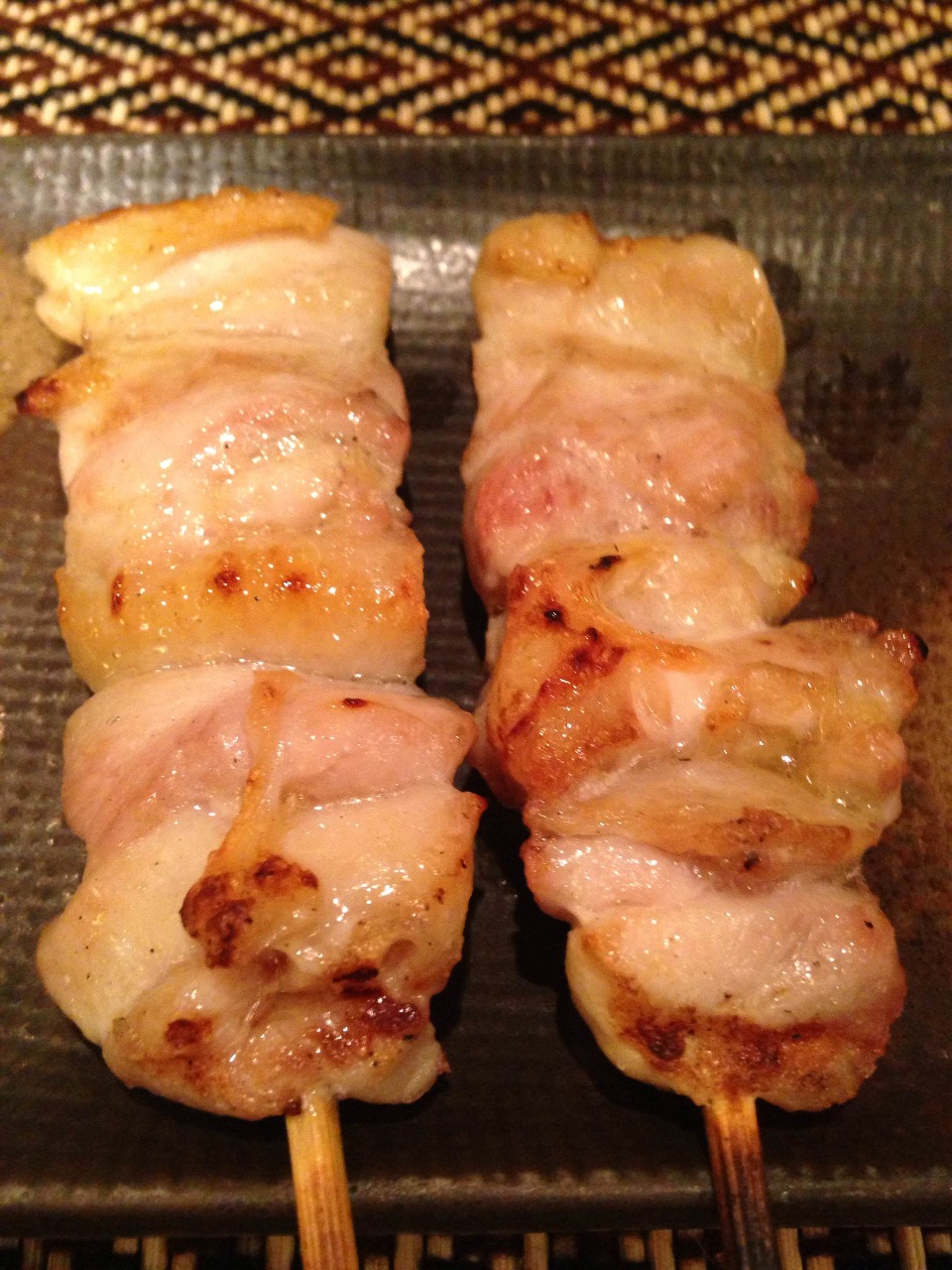 将一口大小的鸡皮穿成串,烤制的料理。