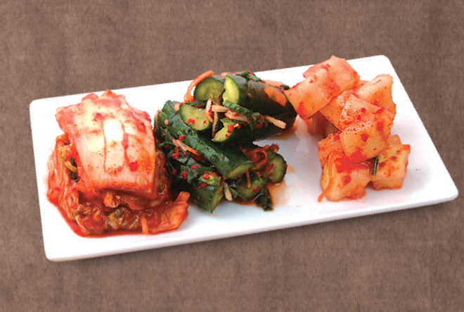 牛肉, 小油菜, 胡萝卜, 大蒜, 白饭, 蛋黄, 海苔, 泡菜
