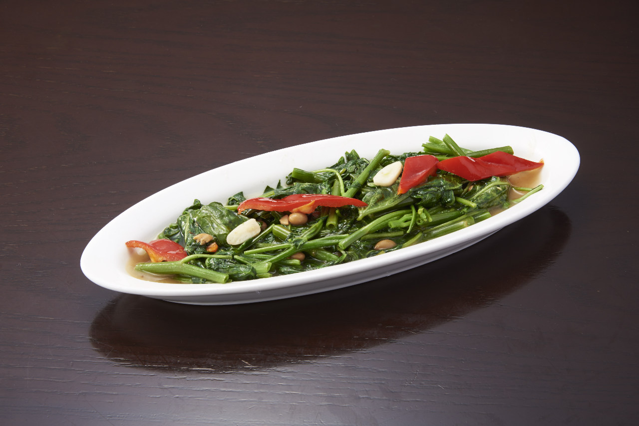 将被称作空心菜的带叶蔬菜中放入大蒜和辣椒,再用油炒制的中国料理。