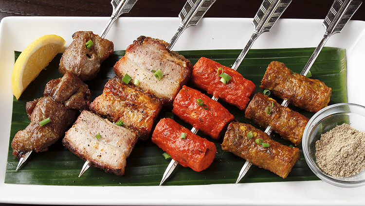 将肉末和切碎的蔬菜与香辣料混合后裹在签子上烤制的料理。