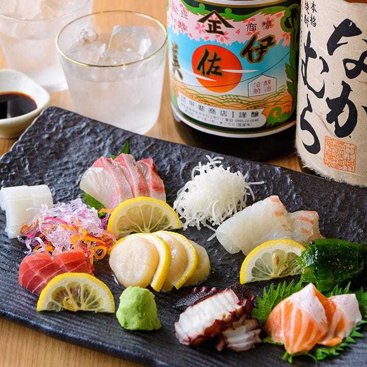 7种海鲜刺身的拼盘料理。
