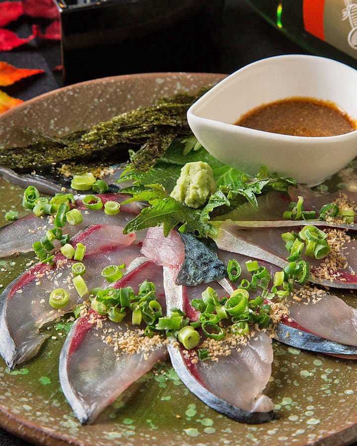 将切片的生红甘鲹鱼用芝麻、酱油和味醂调味的福冈县乡土料理。