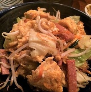 肉,海鲜类和蔬菜炒制后,将面混合再用盐,胡椒调味的料理。