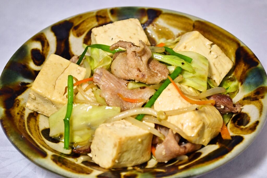 岛豆腐, 猪肉, 甘蓝菜, 胡萝卜, 黄豆芽, 韭菜