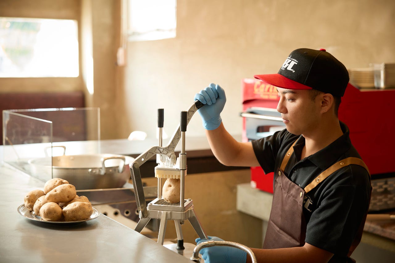 在手机上査看餐厅信息。