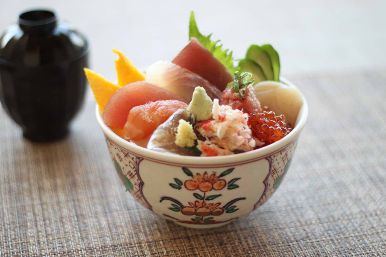 - 食材: 金枪鱼, 扇贝, 鲑鱼卵, 紫苏, 蘘荷, 白饭, 鸡蛋, 虾