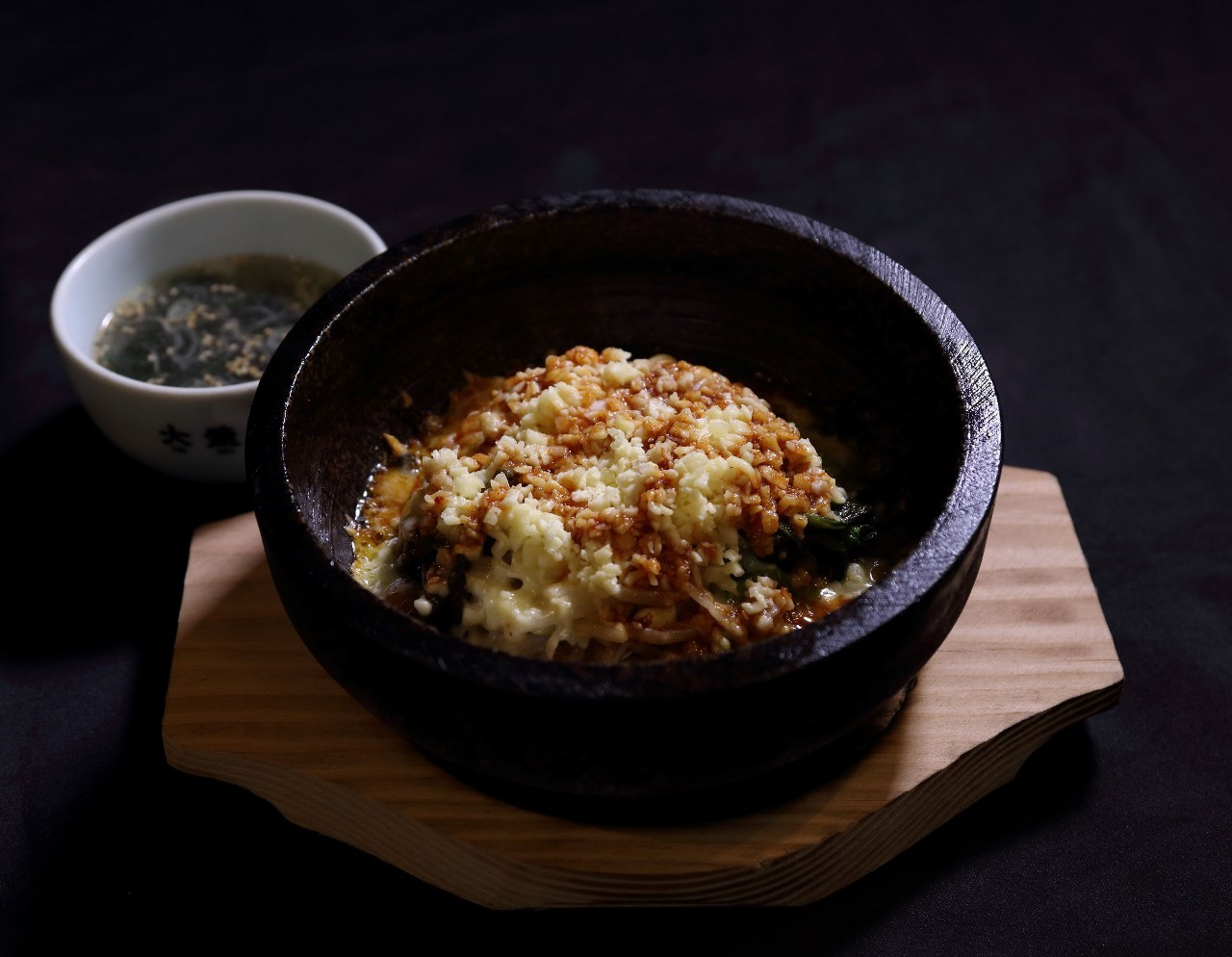在石锅中放上米饭,韩式拌菜,肉,韩国红辣椒酱,鸡蛋等后加热的韩国料理。