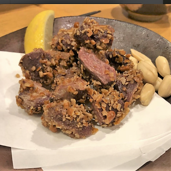 将一口大小的被称为五花肉的猪肋骨周围的部分穿串,直接用火烤制的料理。
